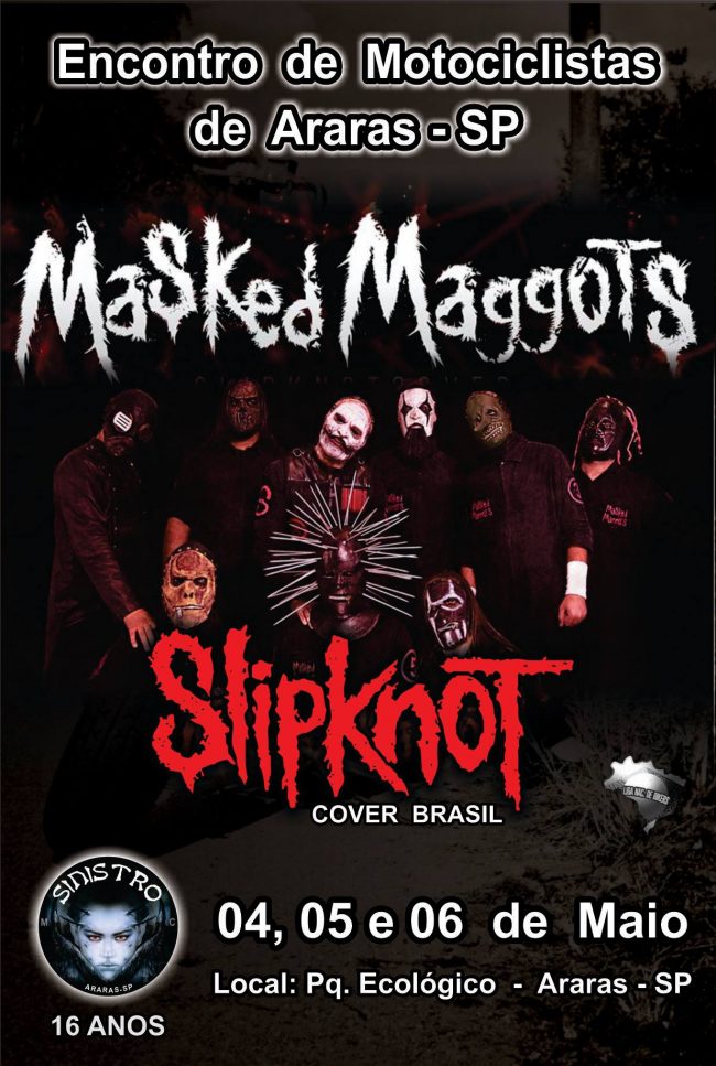 Masked Maggots estará neste grande Encontro Nacional de Motociclista de Araras-SP comemorando os 16 Anos de Sinistro Moto Clube. Sempre com grande receptividade, organização e bandas de alta qualidade. Conta também com ampla estrutura, área de camping coberta com chuveiro aquecido, praça de alimentação, expositores, café da manhã, churrasco, troféus para Moto Clubes e Moto Grupo, e muito mais!!!